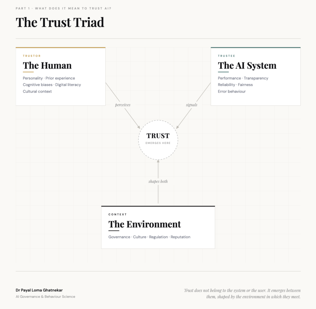 The trustee — the AI system — communicates its trustworthiness through performance, transparency, reliability, fairness, and error behaviour, intentionally or not. The interactive context — the environment — encompasses organisational culture, governance structures, policy frameworks, and institutional reputation. People trust AI less when they distrust the organisation behind it, a pattern consistently demonstrated across healthcare, banking, and public-sector deployments.