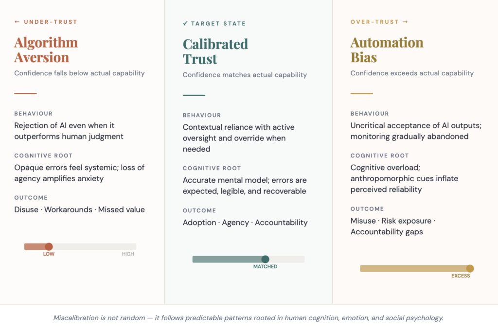 Miscalibrated trust is rarely a user problem. It is the predictable outcome of cognitive overload, uncertainty, and loss of control operating on psychology that evolved to evaluate people, not machines. It is not solved by better algorithms or larger datasets — it is solved by behavioural design, transparent communication, and governance that signals genuine accountability.
